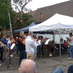 La météo étant mitigée, c’est sous des tonnelles que les musiciens et bénévoles se sont installés. L’Ensemble des Jeunes avec sa cheffe Céline PELLMONT a démarré les festivités avant de laisser la place au pupitre des trompettes. Composé des classes de Kaysersberg et de Turckheim ainsi que de mélomanes, l’Ensemble dirigé par François SCHMITT a assuré l’animation en faisant participer le public. Les bénévoles ont, quant à eux, proposé boissons, tartes flambées et autres pâtisseries faites maison. En deuxième partie, nous avons retrouvé l’Orchestre d’Harmonie de Turckheim avec un programme d’été revisité, mais toujours aussi apprécié du public. La soirée s’est terminée avec l’arrivée de la pluie.